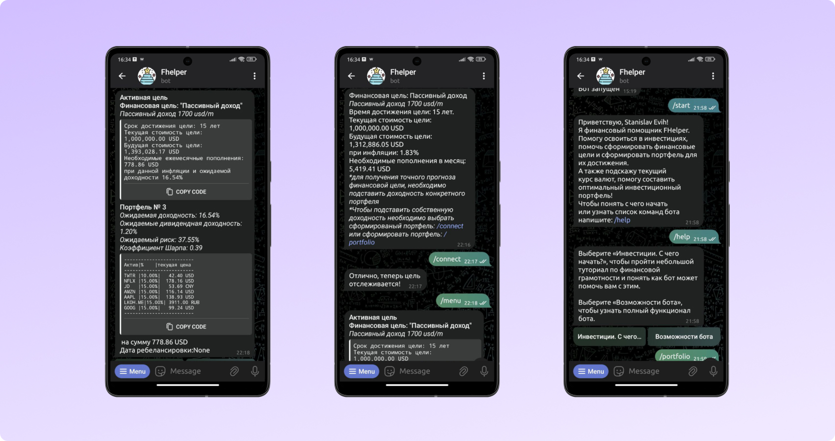 Механизм бота построен на математических моделях расчета окупаемости инвестиций. Курсы и статистика акций подтягиваются через интеграцию с публичными данными.