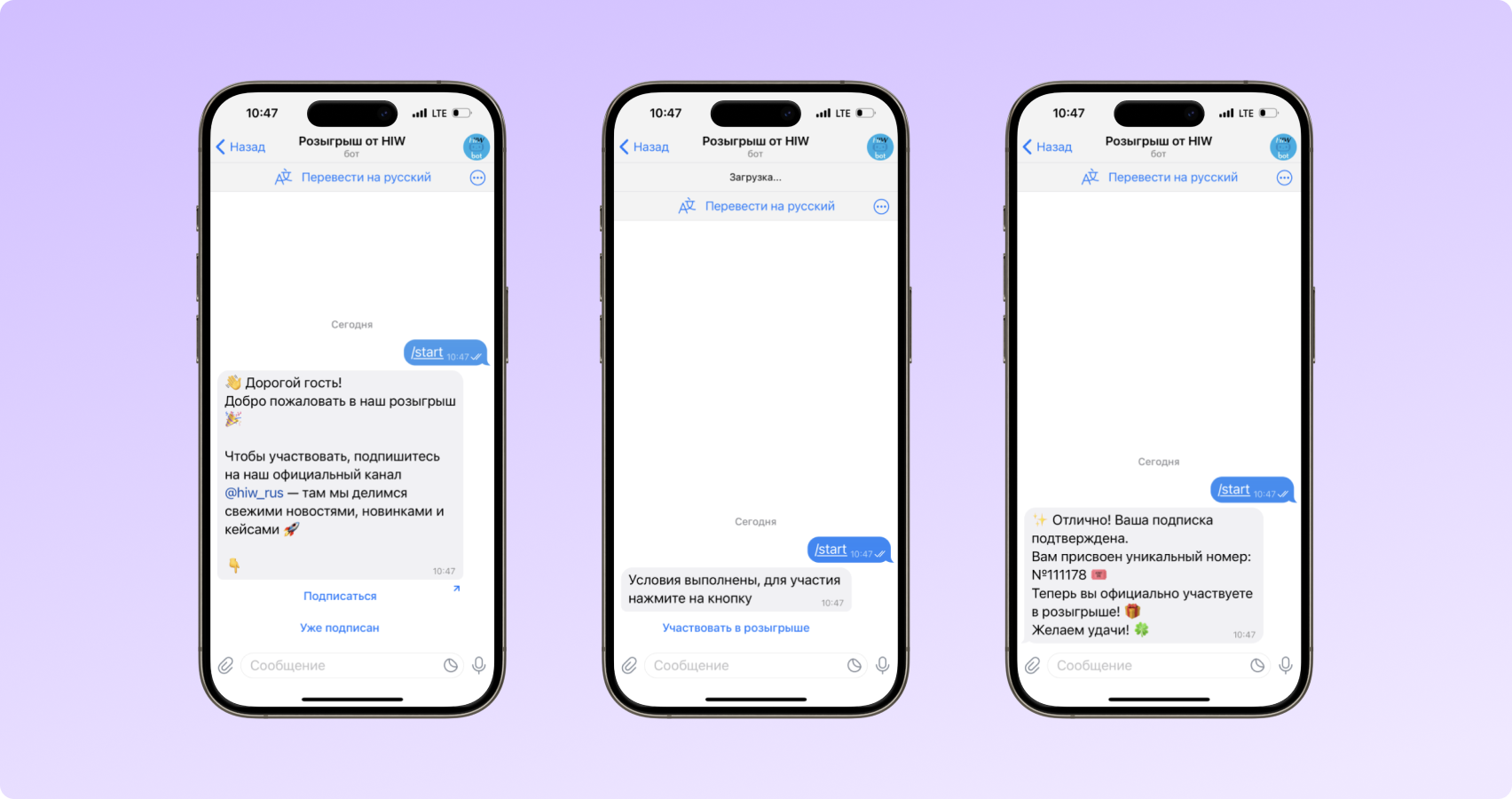 Мы разработали и внедрили чат-бота для проведения викторин и розыгрышей. Пользователь выполнял условия участия (подписка на канал), а бот автоматически фиксировал заявки. Ключевая фишка — админ-панель, где администратор одним кликом мог провести честную жеребьевку и мгновенно оповестить всех победителей через персональные сообщения в Telegram.