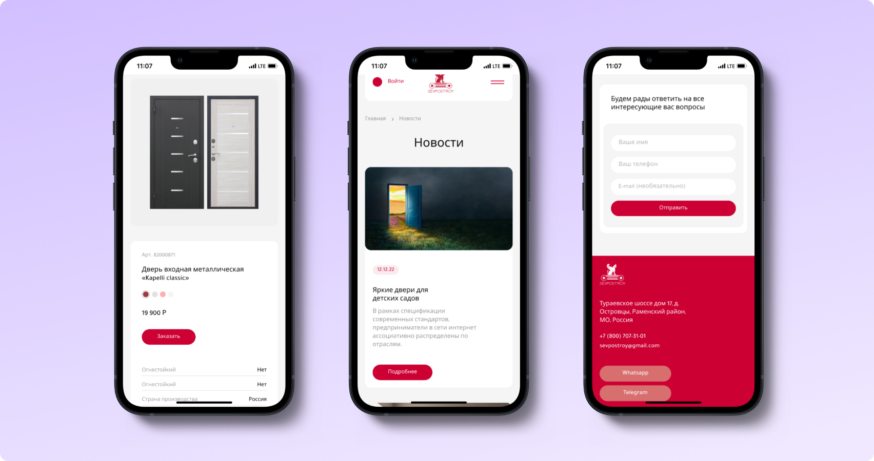 Для данного сайта мы создали умный калькулятор, через который розничные пользователи за счет умного калькулятора сразу могут получить конечную цену установки двери и оставить заявку. Заявки для обработки поступают в Битрикс24 компании Севпострой благодаря интеграции.